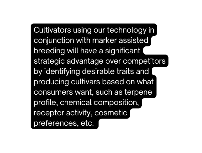 By building an elite library of stabilized genetics, we'll be well positioned to begin implementing this data into use for pharmaceutical studies. We believe this is an "enabling technology" that will crossover into many various sectors of the cannabis industry.